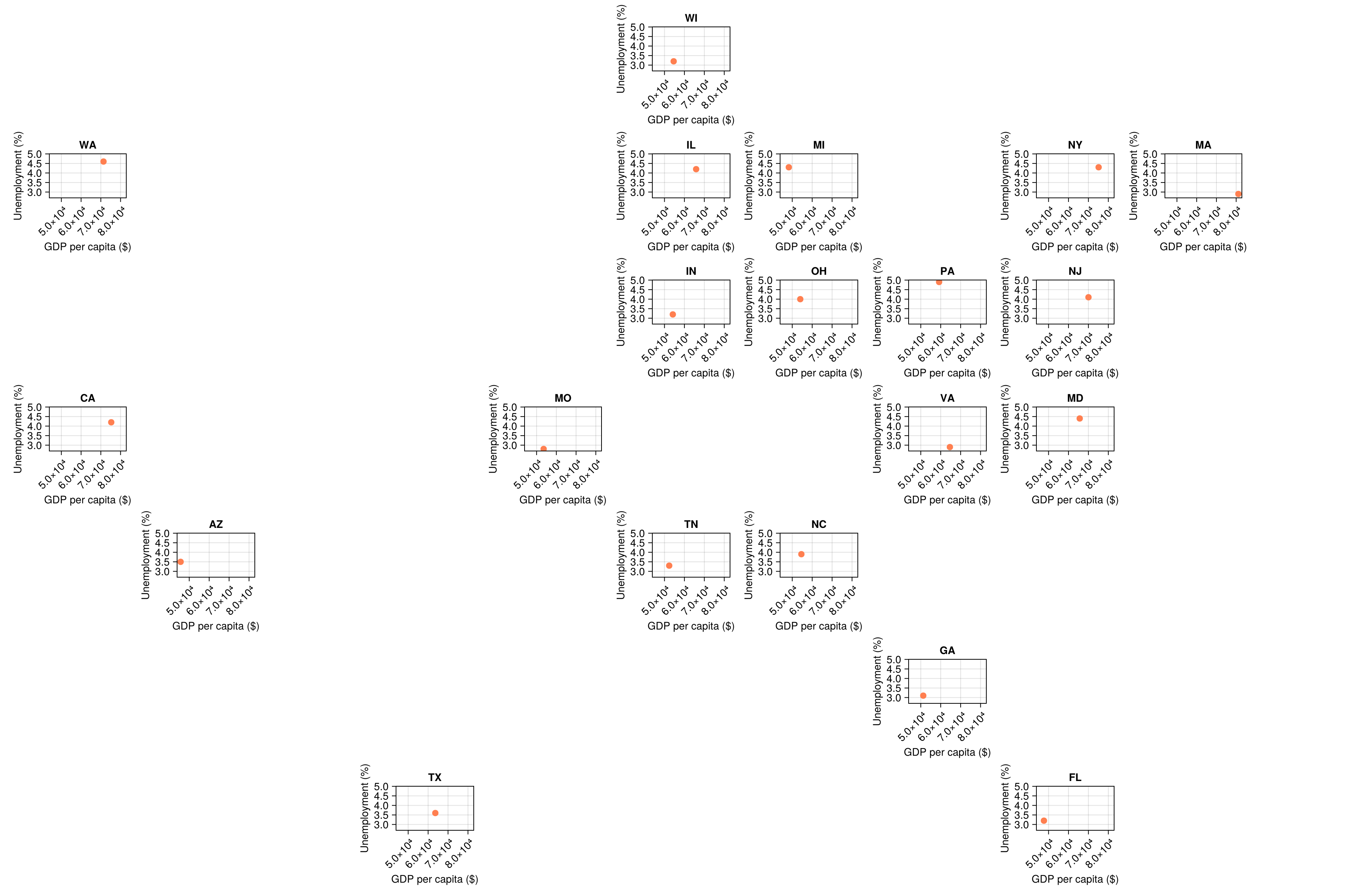 Now let's link axes on a scatter plot. Because we are dealing with larger numbers, to make the x axis tick labels clearer, let's add some rotation. We'll also set the geofacet() kwarg hide_inner_decorations = false to plot all axis ticks and labels on each facet, not just those without a neighbor.